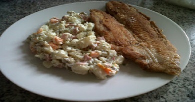 Sírvase de inmediato acompañado de una ensalada fría confeccionada con espaguetis, jamón, mayonesa y queso.