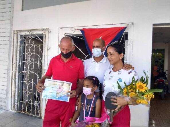 La atleta de tenis de mesa de Caibarién, Katerine Angélica Espino Licor, campeona nacional pioneril en la categoría sub 7 años, fue recibida en su barrio, por autoridades del deporte locales, sus familiares y vecinos.
