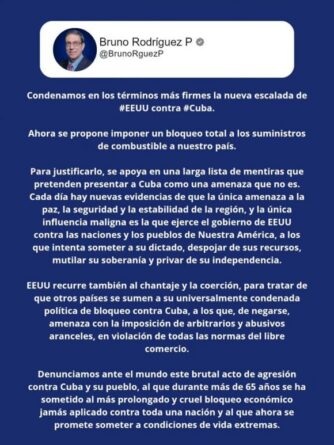 Canciller Bruno Rodríguez en X: Condenamos en los términos más firmes la nueva escalada de EEUU contra Cuba.